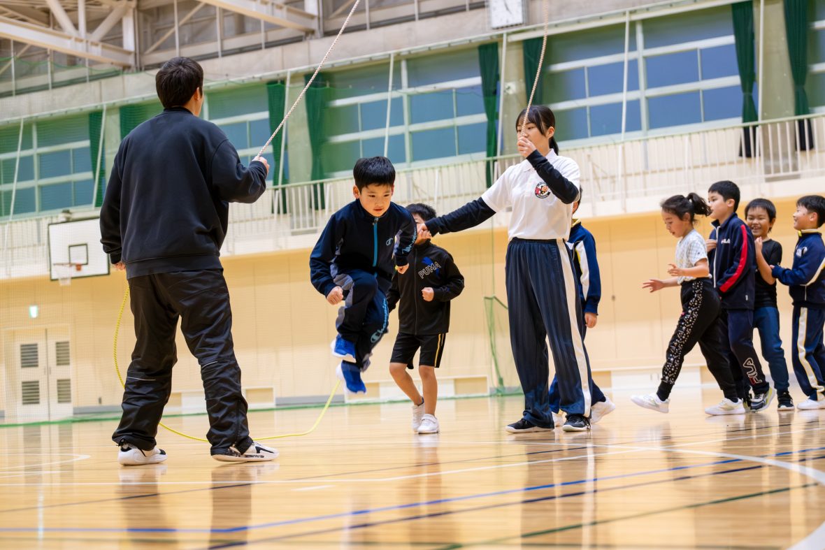 縄跳びでは、基本の技から難しい技やリズムに合わせて跳ぶことに挑戦します。 大縄跳びやダブルダッチ(2本の縄を使う)も行います。 走ることでは、おにごっこなどの走る遊びや、ラダー・ハードルを使用し、敏捷性を身に着け、運動能力の向上を目指します!