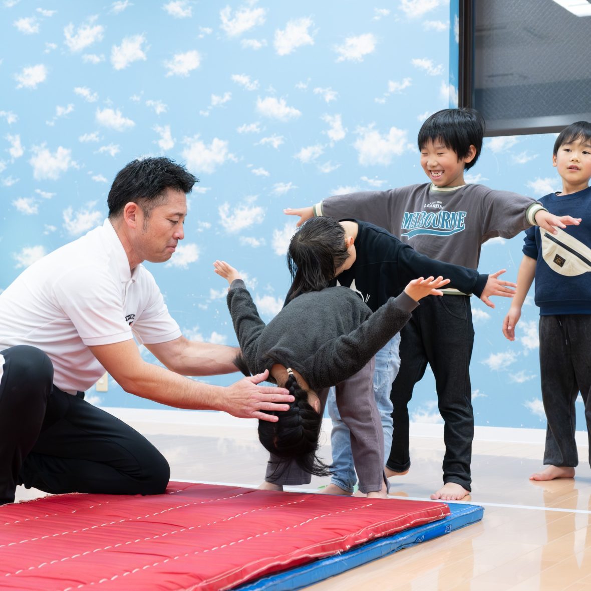 体育クラブでは器械運動を中心に行っています。器械運動を通して逆さ感覚、回転感覚、平衡感覚など自分の体を自分の思い通りに動かす力が身につきます。反対に言うと器械運動で技をするためには様々な感覚が必要なのです。子ども一人一人をじっくりと見てあの子にはこういうことが苦手だからこういう練習をしてみようと考えながら指導をしています。子ども達も十人十色ですから1つの練習で成功する子もいればあれもこれも試してみて成功する子もいます。なかなか出来なかった子がようやく成功した時には子ども以上に喜んでいることもあります。(笑)